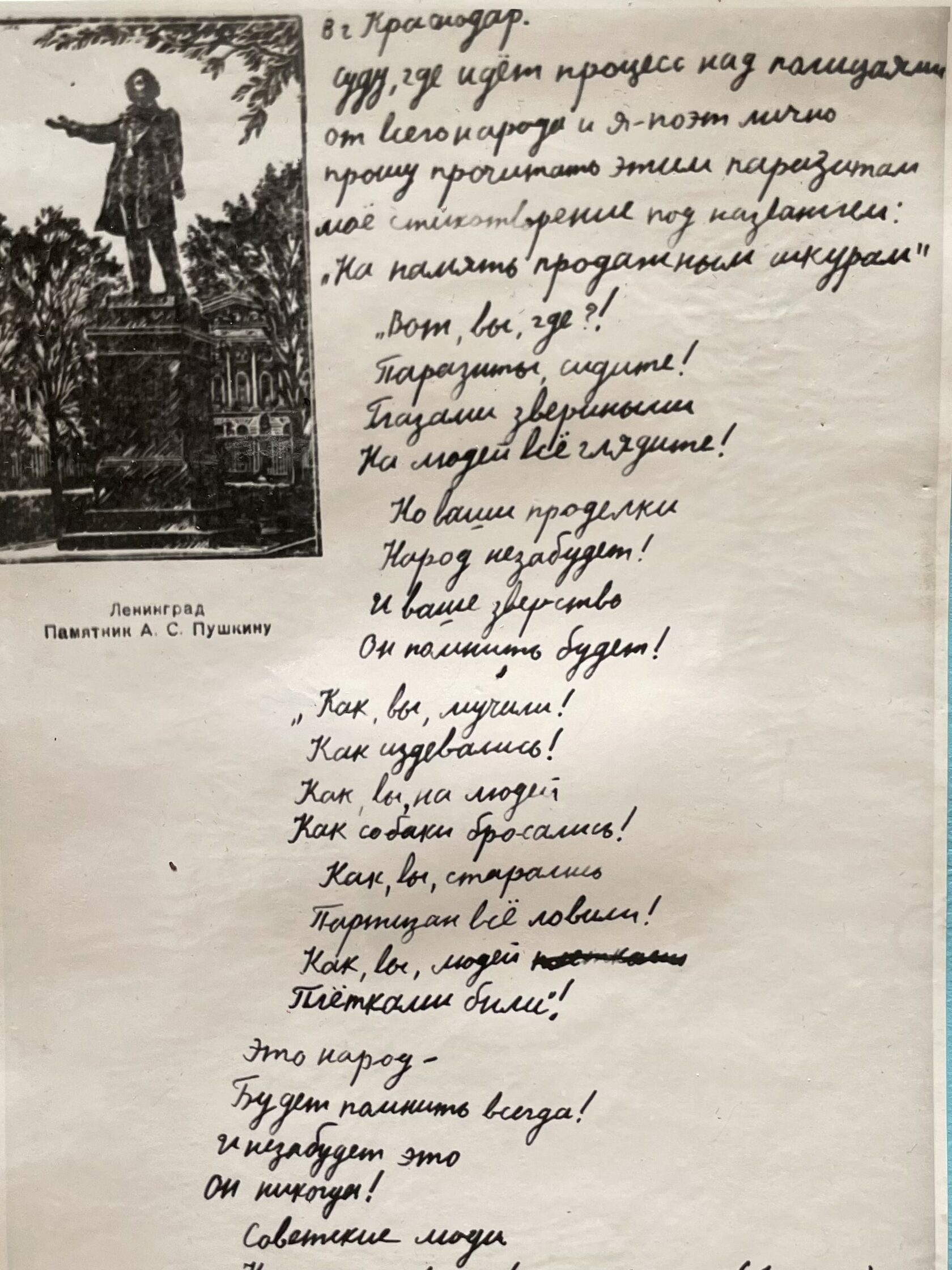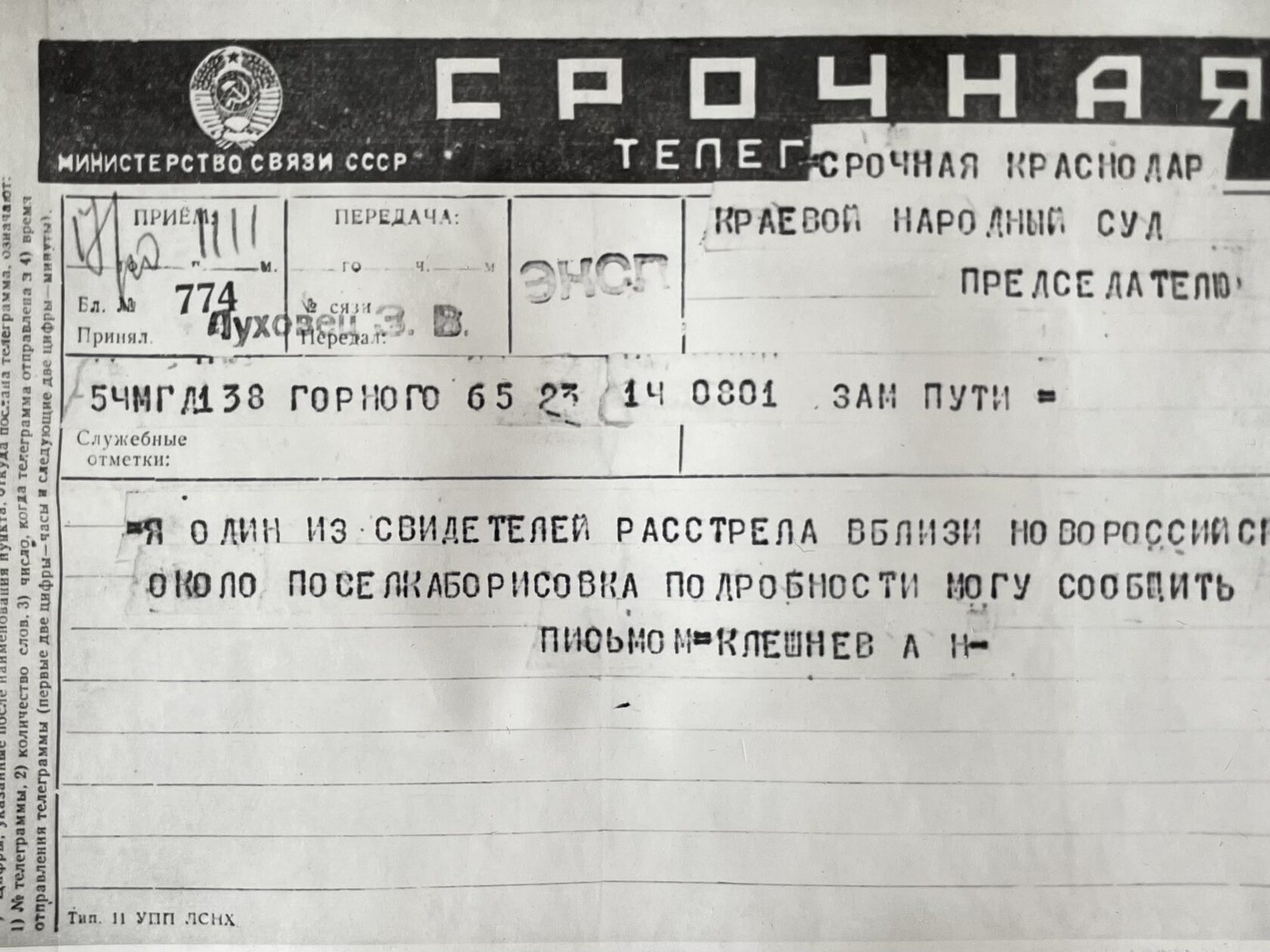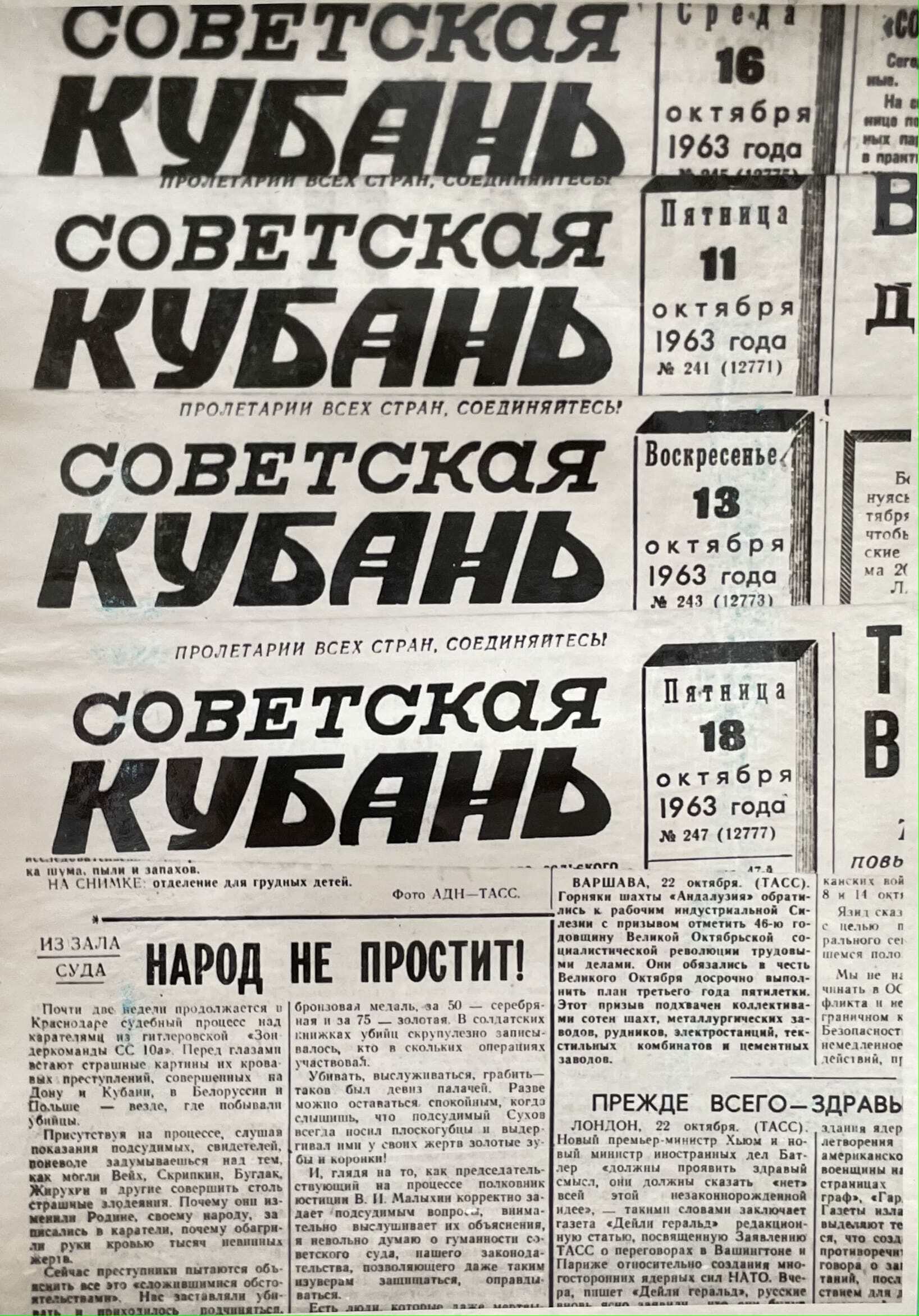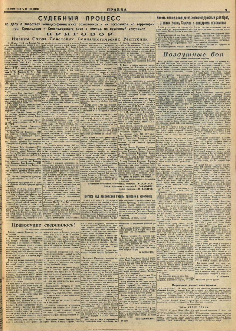 «На центральной площади города Краснодара 18 июля приведен в исполнение приговор над восемью иудами-предателями, пособниками гитлеровских разбойников. Свою позорную жизнь злодеи закончили позорной смертью... Не уйдут от суровой расплаты и их подлые хозяева, гитлеровские палачи. Суровое советское возмездие настигнет всех фашистских зверей, мучителей русского, украинского, белорусского и других народов СССР».