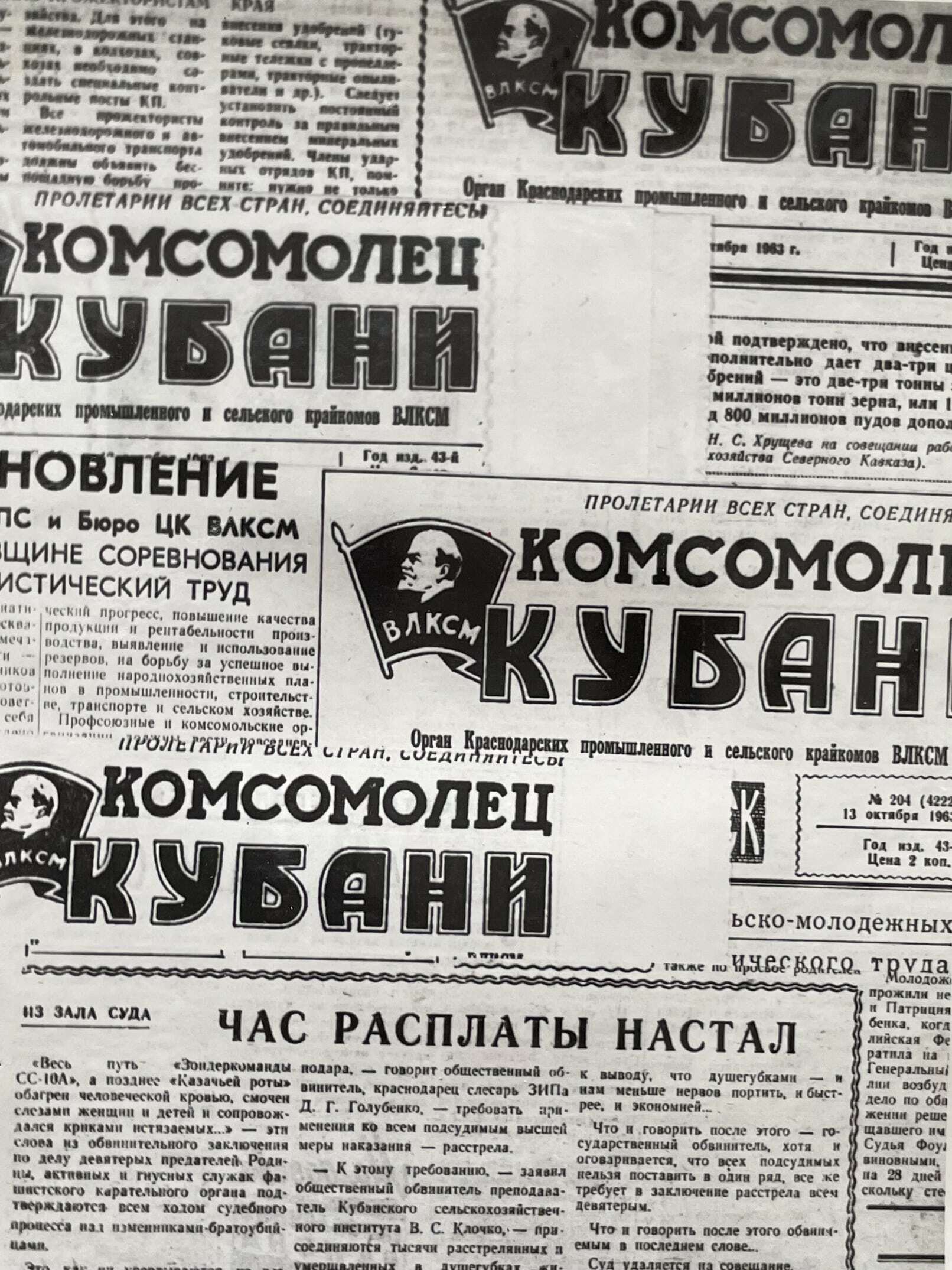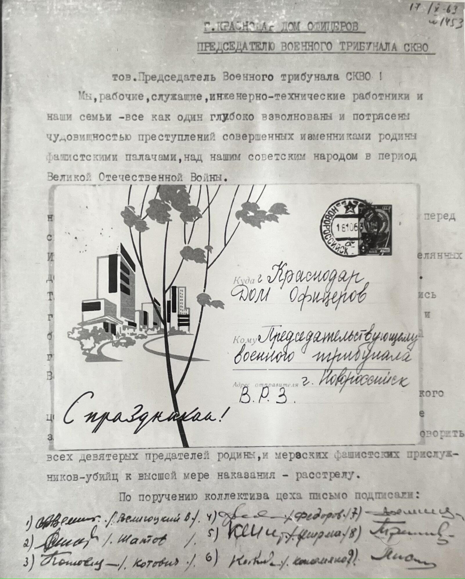 Открытый судебный процесс Военного Трибунала СКВО под председательством генерала-майора юстиции тов. Синельника С.М. в гор. Краснодаре над активными карателями и участниками непосредственных расстрелов и умерщвления многих советских граждан Зубом В.С., Оленченко Н.З., Михельсоном А.Г., Дубогреем В.П., Кругловым В.А. и Василенко А.М.